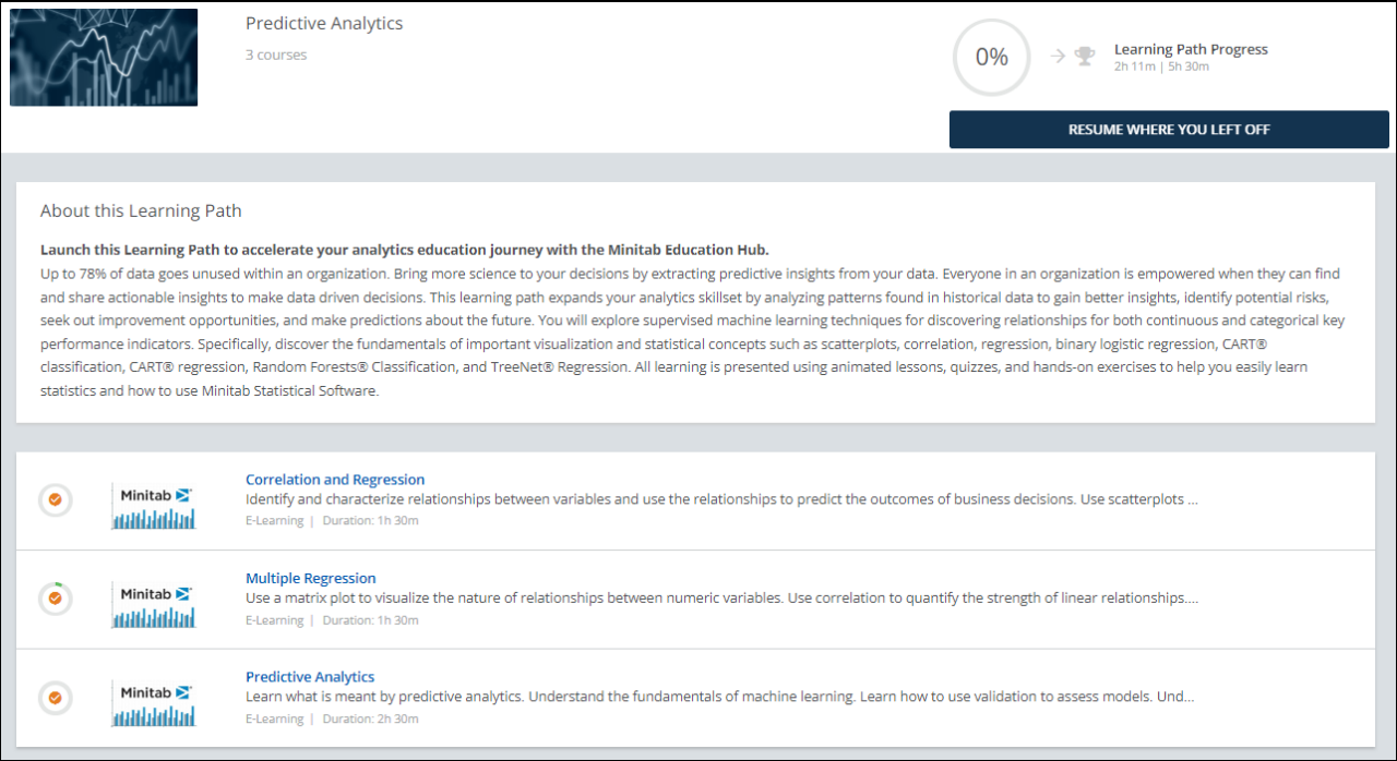 Minitabは、お客様の従業員の成長をサポートすることにも力を入れており、そのために、お客様と密接に連携し、必要なら専門的なアドバイスを提供し、学習教材を定期的に更新して、従業員のスキルセットの上に積み上げる新しいトレーニングと学習計画を提供します。経験の少ない従業員を教育する場合も、熟練した従業員のスキルアップを図る場合も、Minitabの的を絞った学習計画によって学習者は目標に向かって前進し続けることがき、リーダーは直感的なダッシュボードからパフォーマンスと使用状況に関する詳細な洞察を得ることができます。